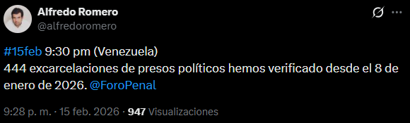 La organización no gubernamental Foro Penal informó este domingo 15 de febrero que, hasta las 9:30 p.m., se han verificado un total de 444 excarcelaciones de presos políticos en todo el territorio nacional. Este balance abarca el periodo iniciado el pasado 8 de enero de 2026, pocos días después de la captura de Nicolás Maduro por parte de fuerzas estadounidenses.