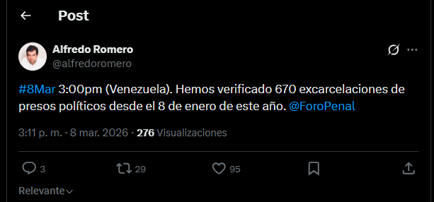 El abogado y presidente de la ONG Foro Penal, Alfredo Romero, informó la tarde de este domingo 8 de marzo que la organización ha logrado verificar 670 excarcelaciones de presos políticos en Venezuela desde el 8 de enero de 2026.