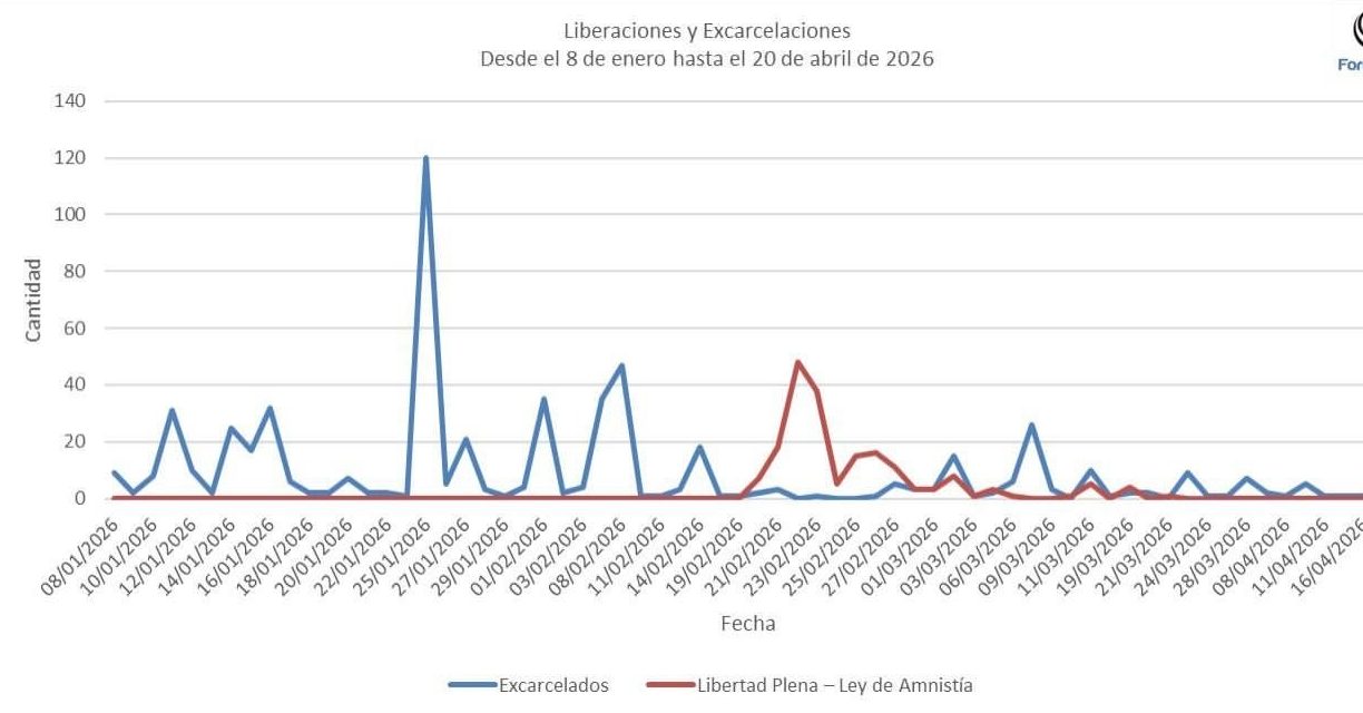 Foro Penal también compartió un gráfico con la evolución de liberaciones registradas, que muestra un pico de amnistías en la primera semana desde la promulgación de la norma, el 20 de febrero, seguido de una disminución progresiva hasta una ralentización casi total desde el 19 de marzo.