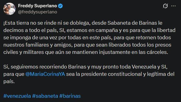 El dirigente de Voluntad Popular, Freddy Superlano, aseguró el pasado viernes 27 de marzo que actualmente se encuentra en campaña política con el objetivo de impulsar la presidencia de María Corina Machado, en medio de un recorrido por el estado Barinas.