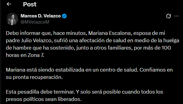 El dirigente político del partido Vente Venezuela, Marcos D. Velazco, informó la noche de este miércoles 18 de febrero a través de su cuenta oficial en X que Mariana Escalona, esposa de su padre Julio Velazco, sufrió una afectación de salud severa tras permanecer en huelga de hambre en las inmediaciones de Zona 7 de Boleíta, donde familiares de presos políticos continúan su protesta por más de 100 horas.