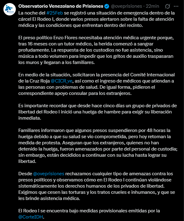 El caso más alarmante es el del preso político Enzo Flores, quien tras 16 meses con un tutor médico, sufrió una herida que comenzó a sangrar profusamente sin recibir atención adecuada de los custodios.