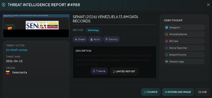 Un actor de ciberamenazas, identificado como “GordonFreeman”, filtró este martes una base de datos masiva del Servicio Nacional Integrado de Administración Aduanera y Tributaria (Seniat), con información de al menos 13,8 millones de contribuyentes venezolanos, entre personas naturales y jurídicas.