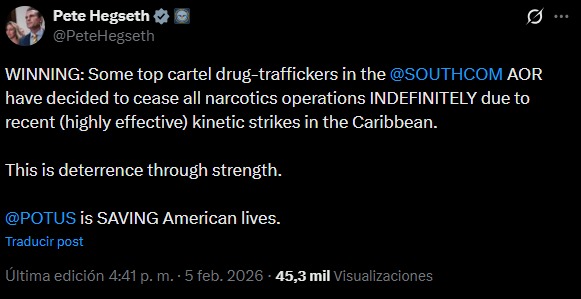 El secretario de Guerra de Estados Unidos, Pete Hegseth, afirmó este jueves 5 de febrero que importantes grupos de narcotráfico decidieron detener sus actividades de manera indefinida en el área de responsabilidad del Comando Sur. El funcionario atribuyó esta paralización a la efectividad de las recientes acciones militares ofensivas ejecutadas en la región del Caribe contra las estructuras criminales.