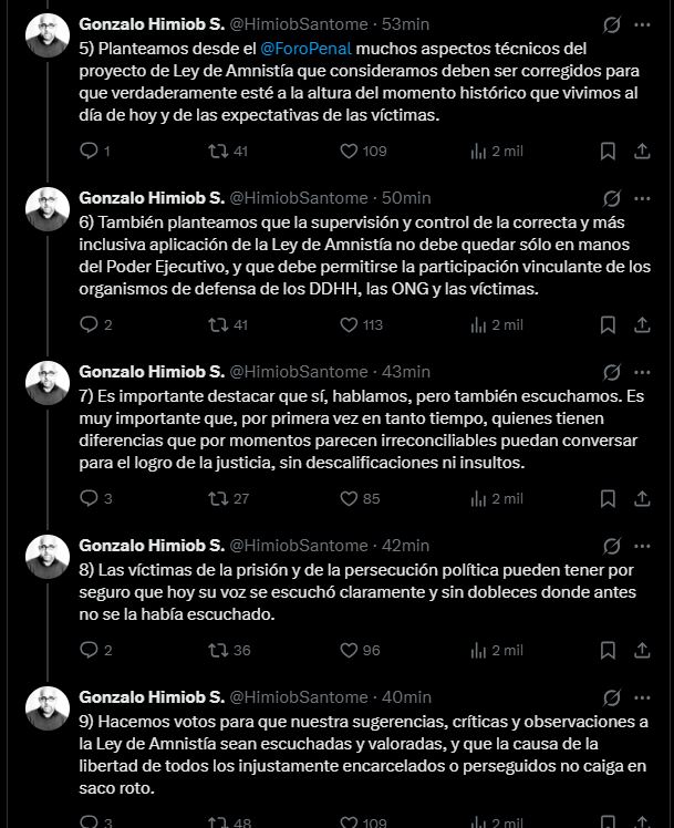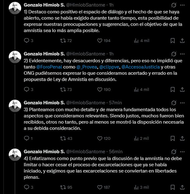 A través de un hilo publicado en su cuenta oficial de X (antes Twitter), Himiob detalló que varias ONG, entre ellas Foro Penal, Provea, Clippve y Acceso a la Justicia, acudieron a la convocatoria de la Comisión Parlamentaria encargada de evaluar la Ley de Amnistía, donde expusieron sus planteamientos “con mucho detalle y sin limitaciones”.