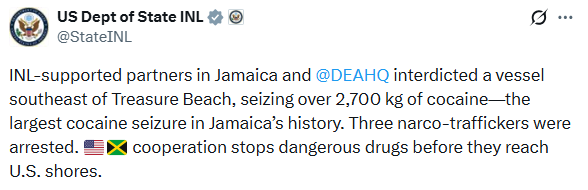 Socios apoyados por la Oficina de Asuntos Internacionales de Narcóticos y Aplicación de la Ley del Departamento de Estado de EEUU (INL) y la DEA interceptaron una embarcación en Treasure Beach, logrando la mayor incautación de cocaína en la historia del país caribeño y la detención de tres presuntos narcotraficantes.