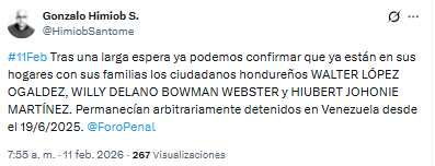 Tras casi ocho meses de detención arbitraria, los hondureños Walter López Ogaldez, Willy Delano Bowman Webster y Hiubert Johonie Martínez finalmente regresaron a sus hogares.