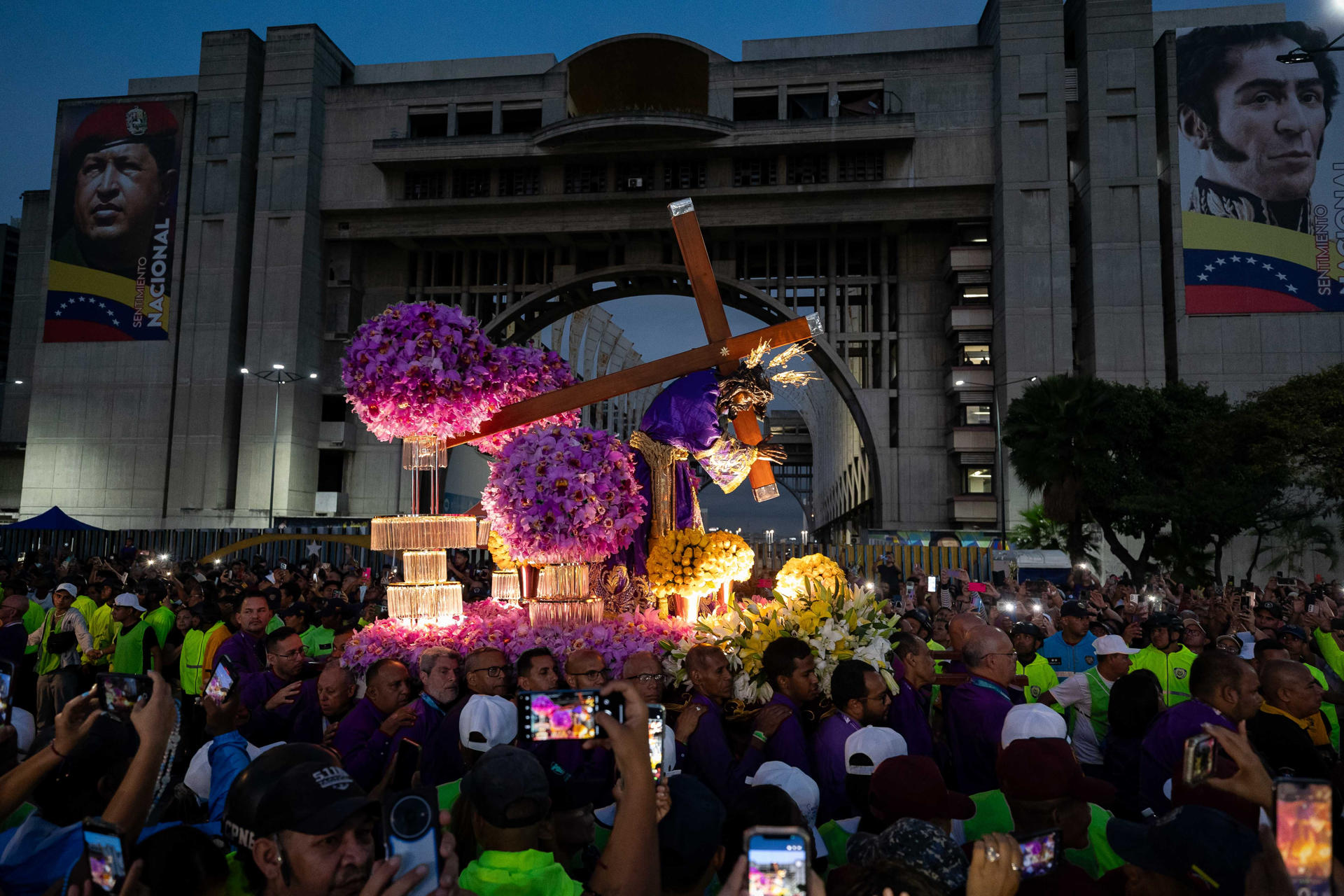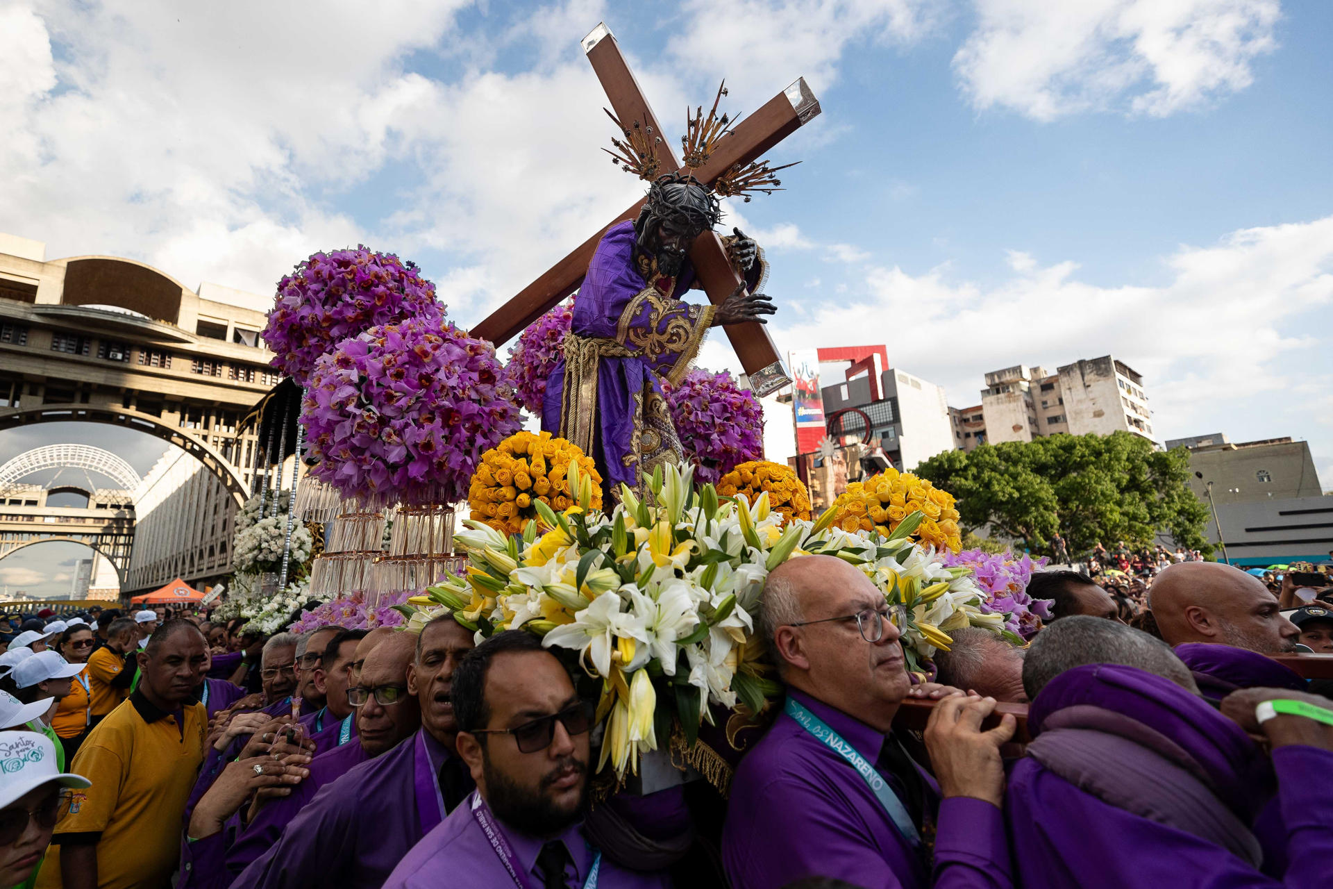 La figura del Nazareno estaba rodeada de 6.000 orquídeas moradas, la flor nacional de Venezuela, y de 600 flores amarillas, que fueron donadas por sus devotos hasta el pasado lunes.