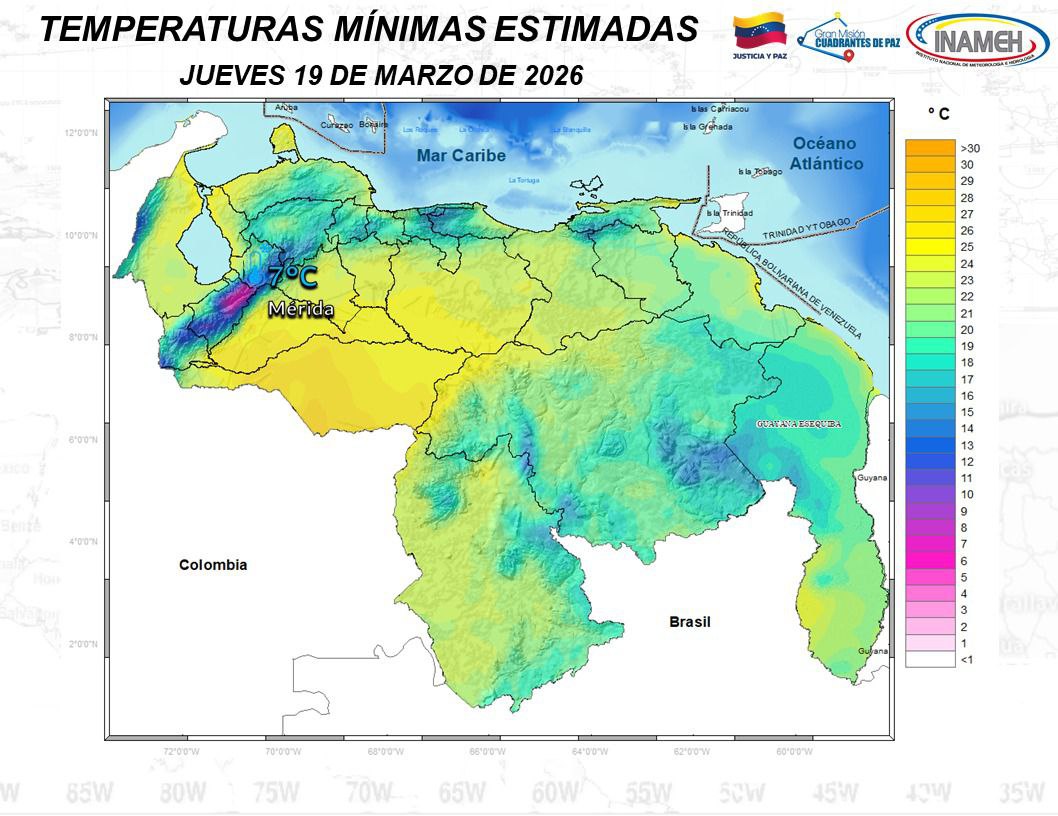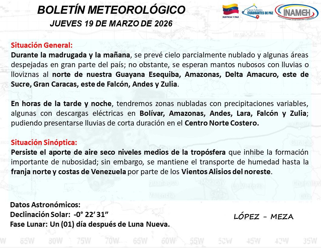 El Instituto Nacional de Meteorología e Hidrología (Inameh) informó que para este jueves 19 de marzo, Venezuela amanece con cielo parcialmente nublado en buena parte del territorio nacional, aunque se mantienen áreas con nubosidad asociada a lluvias en varias regiones del país.