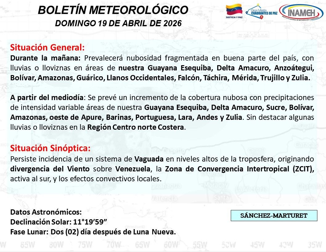 Asimismo, el Inameh señaló que se mantienen condiciones variables entre nubosidad y zonas despejadas, aunque con precipitaciones en sectores de la Guayana Esequiba, Bolívar, Amazonas, Guárico, Los Andes y Zulia.