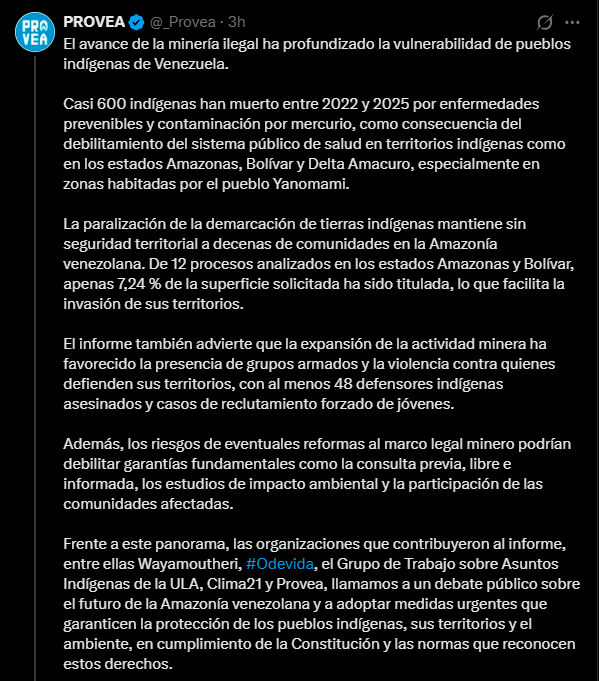 De acuerdo con el informe, casi 600 indígenas murieron entre 2022 y 2025 por enfermedades prevenibles y por contaminación con mercurio, en medio del debilitamiento del sistema público de salud en territorios indígenas de los estados Amazonas, Bolívar y Delta Amacuro. Las comunidades del pueblo Yanomami figuran entre las más afectadas por esta situación.