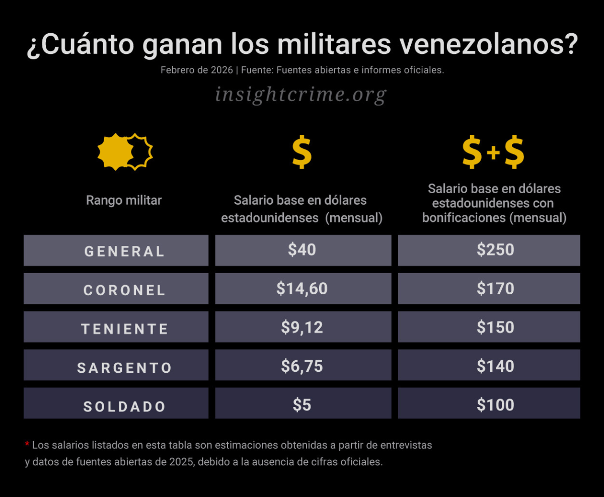 Un exmilitar que habló con InSight Crime señaló que un coronel de la Fuerza Armada Nacional Bolivariana (FANB) gana aproximadamente US$170 al mes, incluidos bonos; un teniente recibe alrededor de US$150; y un sargento, cerca de US$140. En contraste, un solo gramo de oro puede venderse por unos US$125 en el mercado local, y las tarifas que algunos militares cobran por autorizar operaciones mineras o vuelos irregulares pueden equivaler a varios meses de salario.