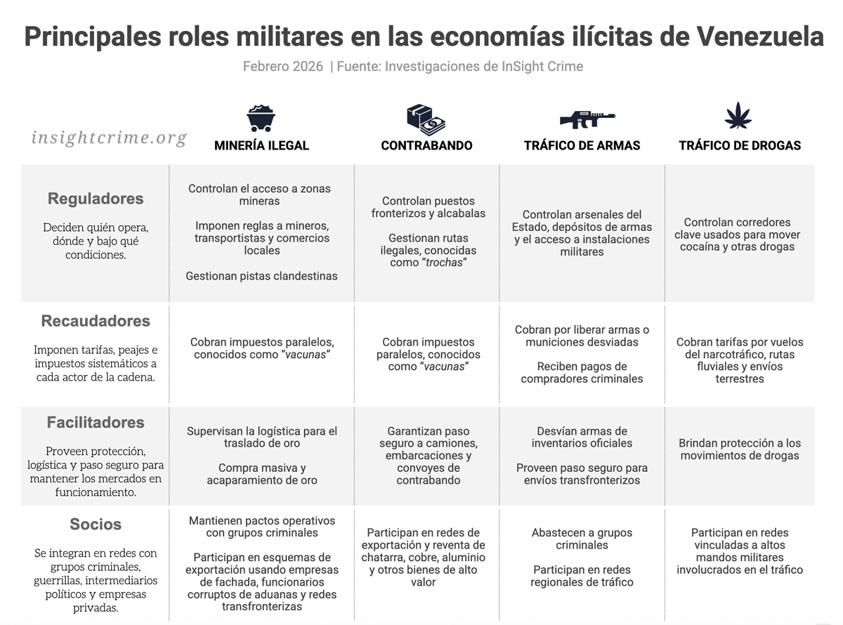 Bajo Maduro, otras economías ilegales se convirtieron cada vez más en un salvavidas financiero para miles de militares, quienes han ampliado su papel dentro del ecosistema criminal venezolano con la bendición del Estado.