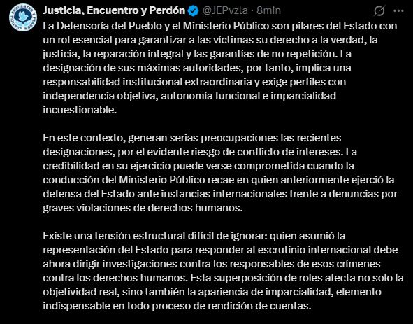 El comunicado concluye con un llamado a la reflexión sobre la necesidad de instituciones independientes en Venezuela. La JEP advierte que sin estas, el proceso de restablecimiento de derechos humanos se ve obstaculizado, perpetuando la desconfianza ciudadana y la vulnerabilidad de la población.