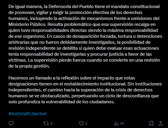 Según la organización, estos organismos son pilares fundamentales del Estado, con un rol clave en garantizar derechos humanos, la verdad, la justicia, la reparación integral y las garantías de no repetición para las víctimas de violaciones de derechos humanos.