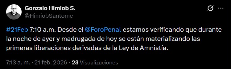 La mañana de este sábado 21 de febrero, el vicepresidente de Foro Penal, Gonzalo Himiob, confirmó que el proceso ya comenzó a materializarse.