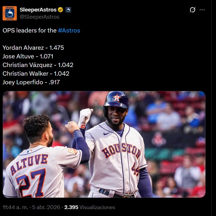 José Altuve comenzó empezó con buen ritmo ofensivo. Tras sumar hit y base por bolas en la jornada sabatina, dejó promedios de .321/.500/.571 después de 38 viajes al plato.