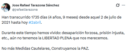 A través de la cuenta en X de Rafael Tarazona, se denunció que durante este tiempo los afectados han sido víctimas de desaparición forzosa y prisión injusta, sin que hasta la fecha se haya otorgado la libertad plena que legalmente les corresponde.