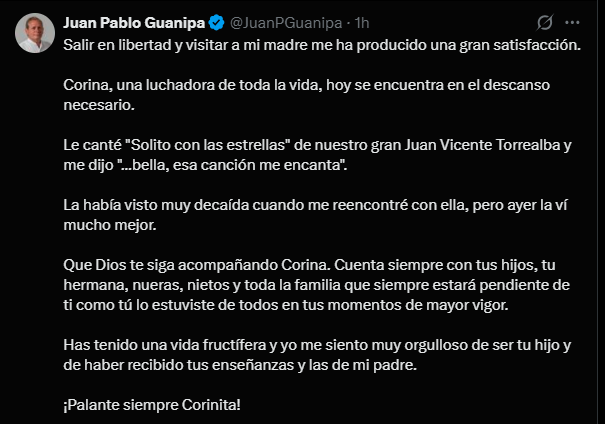 En la publicación, Juan Pablo Guanipa manifestó que “salir en libertad y visitar a su madre le ha producido una gran satisfacción”, dejando ver el profundo significado personal que tuvo el reencuentro.