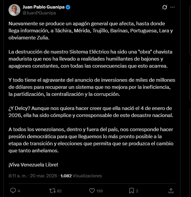 El dirigente opositor Juan Pablo Guanipa denunció este viernes 20 de marzo que un nuevo apagón general afectó a varios estados del país, evidenciando, a su juicio, el colapso del sistema eléctrico nacional.