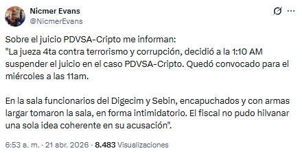 En horas de la madrugada de este martes 21 de abril, la jueza Cuarta contra el Terrorismo y la Corrupción suspendió el juicio correspondiente al caso Pdvsa-Cripto.
