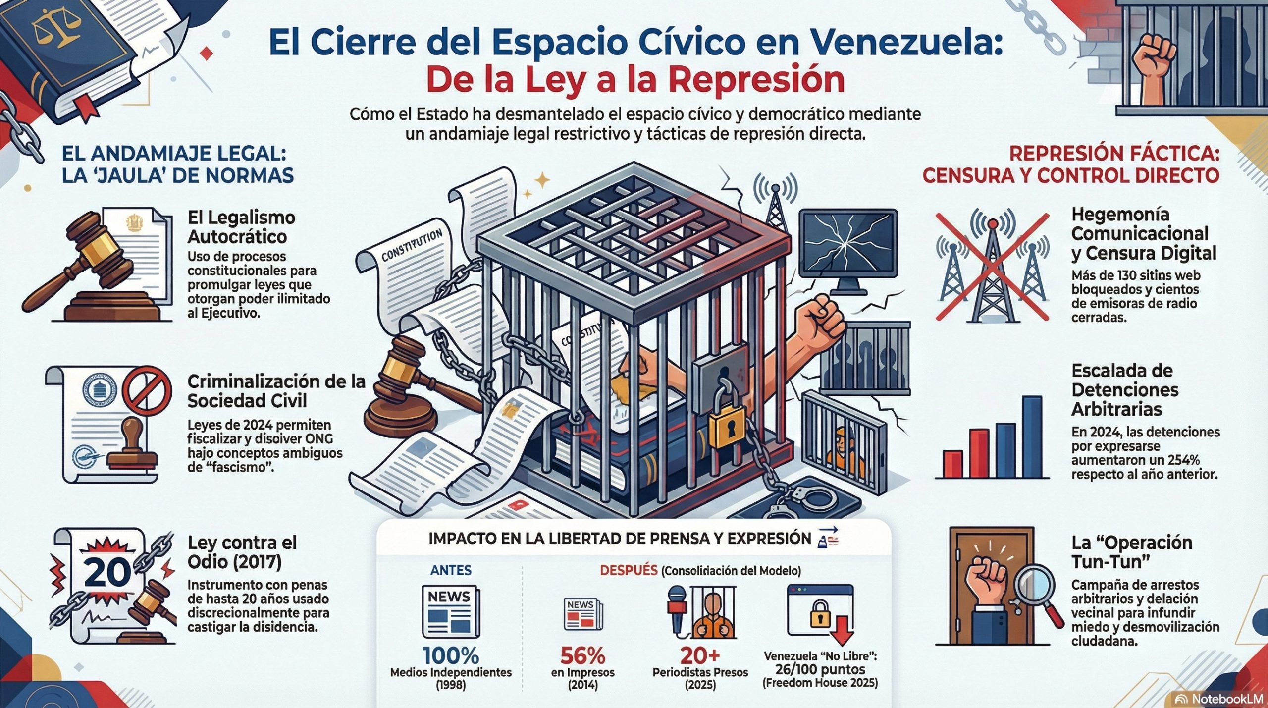 En Venezuela, la restricción de internet y del espacio digital se ejecuta mediante un entramado de leyes restrictivas y mecanismos tecnológicos de vigilancia y censura, diseñados para controlar la narrativa pública y suprimir la disidencia.