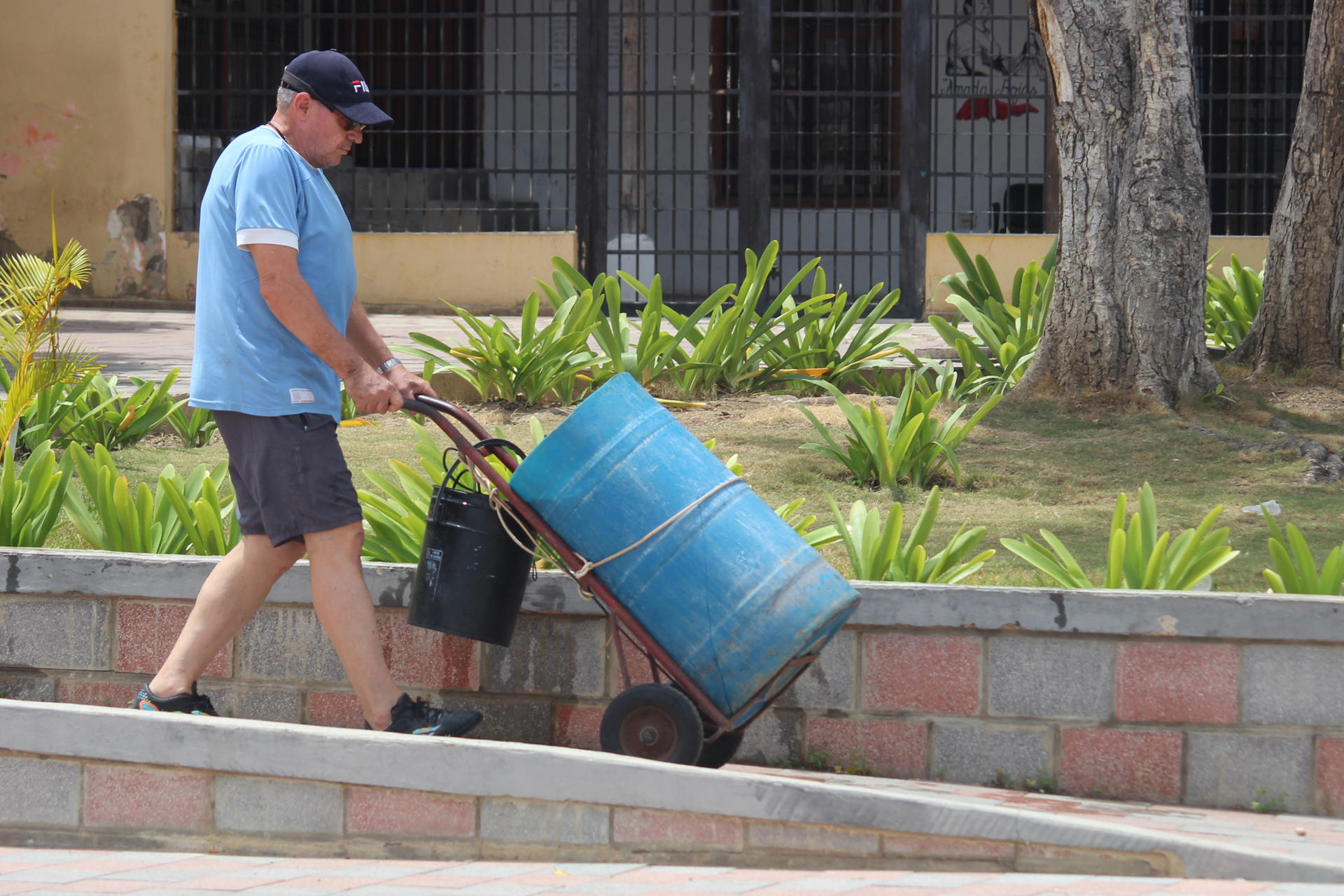 Este hombre de 63 años se vale de un carro artesanal para llevar agua desde una toma ubicada en una plaza pública, que, por suerte, está a escasos metros de su casa, pero que en ocasiones no funciona.
