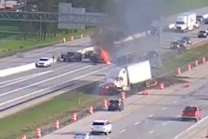 Las imágenes obtenidas por NBC4 muestran cómo el camión Freightliner blanco de Ngom chocó contra un coche rojo, lo que provocó un accidente en el que se vieron involucrados nueve vehículos en la Interestatal 71 y dejó varios coches envueltos en llamas.
