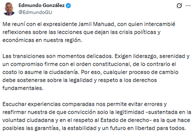 El presidente electo de Venezuela, Edmundo González Urrutia, se reunió con el expresidente de Ecuador, Jamil Mahuad, para intercambiar reflexiones sobre las crisis políticas y económicas que han afectado a la región.