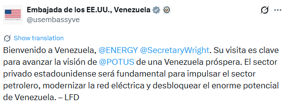 Dogu calificó la presencia de Wright como una pieza clave para avanzar en la visión del presidente Donald Trump sobre una «Venezuela próspera». En su declaración, la funcionaria fue específica al señalar las áreas prioritarias de cooperación. «El sector privado estadounidense será fundamental para impulsar el sector petrolero, modernizar la red eléctrica y desbloquear el enorme potencial de Venezuela».