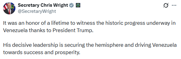 El secretario de Energía de Estados Unidos, Chris Wright, calificó como un honor presenciar los cambios que ocurren actualmente en Venezuela tras la visita de dos días que realizara al país. En tal sentido, el funcionario atribuyó este sábado el avance de la situación política y económica nacional al liderazgo ejercido por el presidente Donald Trump en la región.