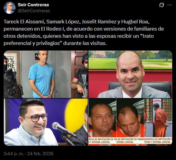 «Tareck El Aissami, Samark López, Joselit Ramírez y Hugbel Roa, permanecen en El Rodeo I, de acuerdo con versiones de familiares de otros detenidos, quienes han visto a las esposas recibir un “trato preferencial y privilegios” durante las visitas», dijo Contreras.