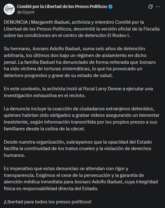 A través de una publicación en X, Baduel rechazó el comunicado de la Fiscalía chavista sobre la situación en el centro penitenciario y afirmó que su hermano, Josnars Adolfo Baduel, suma seis años de detención arbitraria, los dos últimos bajo un régimen de aislamiento en ese lugar.