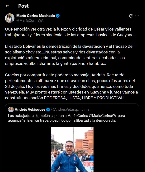 A través de su cuenta oficial en X (antes Twitter), Machado respondió a una publicación del dirigente opositor y aliado, Andrés Velásquez, quien compartió un video de líderes sindicales de las empresas básicas de Guayana manifestando su respaldo a la ruta democrática.