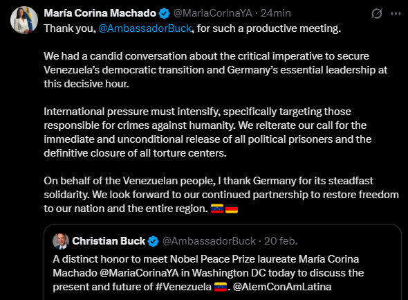 La líder de las fuerzas democráticas venezolana, María Corina Machado, galardonada con el Premio Nobel de la Paz 2025, emitió un mensaje contundente la noche del sábado 21 de febrero en su cuenta oficial de X tras sostener una reunión de alto nivel en Estados Unidos con Christian Buck, Director General de Asuntos Políticos del Ministerio de Relaciones Exteriores de Alemania.