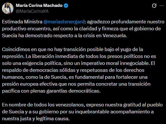 «En nombre de todos los venezolanos, expreso nuestra gratitud al pueblo de Suecia y a su gobierno por su inquebrantable acompañamiento a nuestra justa y legítima causa», concluyó Machado.
