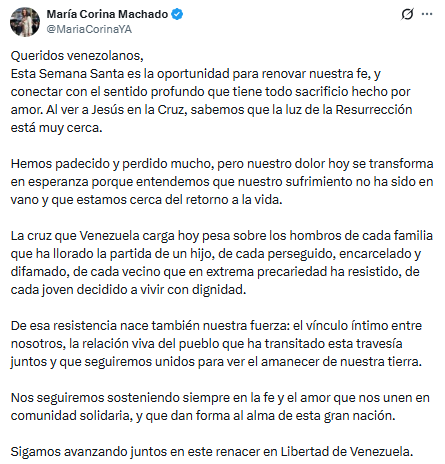 La líder venezolana María Corina Machado envió este domingo un mensaje en el que invitó a los venezolanos a renovar su fe y conectar con el sentido del sacrificio por amor.