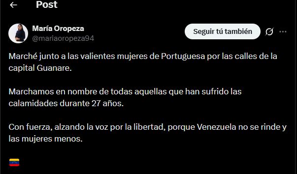 A través de un video publicado en su cuenta oficial de X, Oropeza mostró el recorrido por las principales avenidas de Guanare, donde estuvo acompañada por cientos de ciudadanas que se sumaron al llamado por la libertad del país.