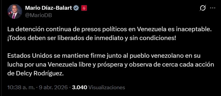 El congresista estadounidense Mario Díaz-Balart se pronunció este jueves sobre la situación de los presos políticos en Venezuela y aseguró que su permanencia tras las rejas sigue siendo inaceptable.