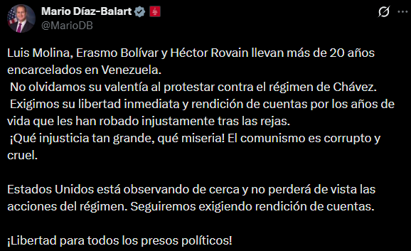«Luis Molina, Erasmo Bolívar y Héctor Rovain llevan más de 20 años encarcelados en Venezuela. No olvidamos su valentía al protestar contra el régimen de (Hugo) Chávez», recordó Díaz-Balart en referencia a los hechos violentos en abril del año 2002.