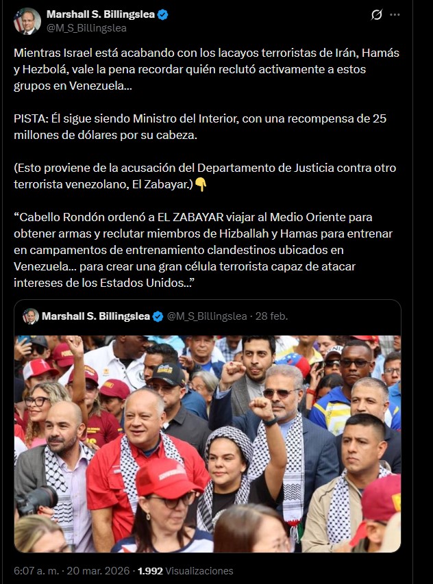 A través de su cuenta en X, Billingslea lanzó el señalamiento en medio del contexto internacional actual: “Mientras Israel está acabando con los lacayos terroristas de Irán, Hamás y Hezbolá, vale la pena recordar quién reclutó activamente a estos grupos en Venezuela…”, escribió.