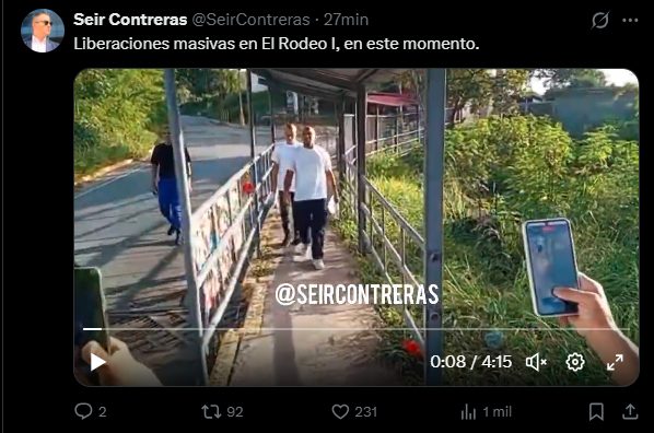 El periodista venezolano Seir Contreras informó durante la tarde del lunes 23 de febrero, sobre el inicio de un proceso de liberaciones masivas de presos políticos recluidos en el Centro Penitenciario El Rodeo I, en el estado Miranda. Este acontecimiento ocurre tras una tensa jornada de protestas dentro del penal.