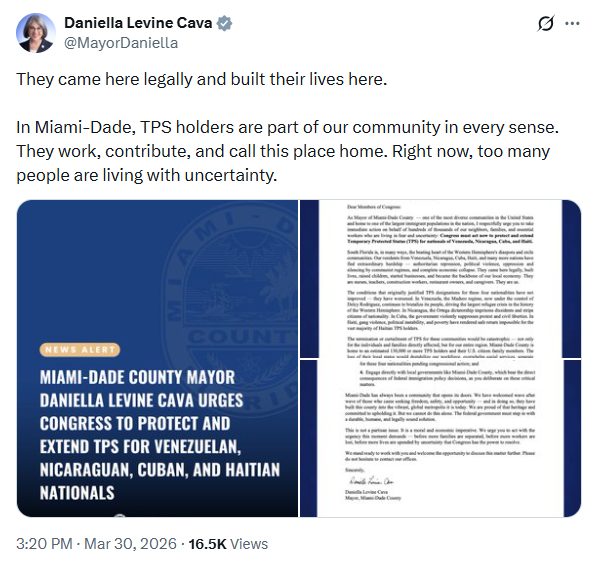 De acuerdo con el comunicado oficial emitido el 30 de marzo de 2026 por la Oficina de la Alcaldesa de Miami-Dade, Levine Cava instó a los legisladores federales a intervenir de inmediato para preservar este beneficio migratorio.