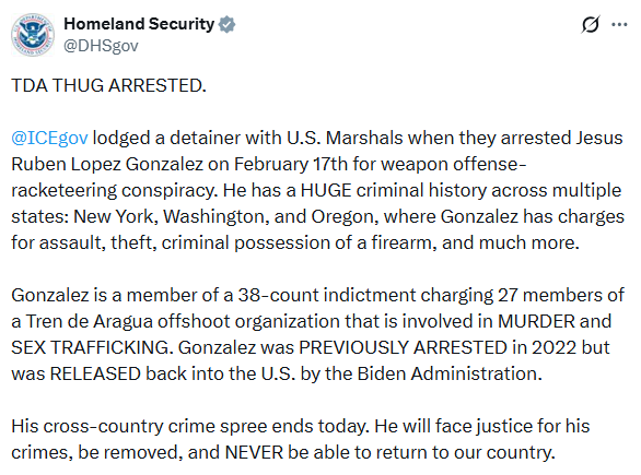 El Departamento de Seguridad Nacional de Estados Unidos informó sobre la captura de Jesús Rubén López González, un venezolano a quien las autoridades norteamericanas identificaron como presunto miembro de una organización derivada del Tren de Aragua. La detención se habría llevado a cabo el pasado 17 de febrero.