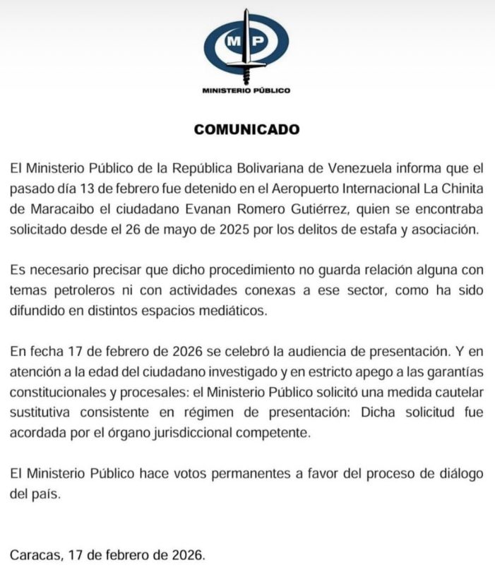Asimismo, el MP insistió en «precisar» que el procedimiento «no guarda relación alguna con temas petroleros ni con actividades conexas a ese sector, como ha sido en distintos espacios mediáticos».
