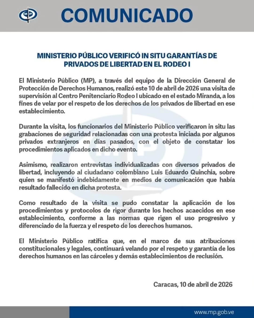 No obstante, el Ministerio Público no ofreció mayores detalles sobre las denuncias de torturas, represión ni sobre las circunstancias específicas de la protesta pacífica dentro de la cárcel.