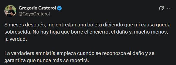 A través de una publicación en su cuenta de X, Graterol señaló que recibió la notificación oficial de su caso ocho meses después de su excarcelación.