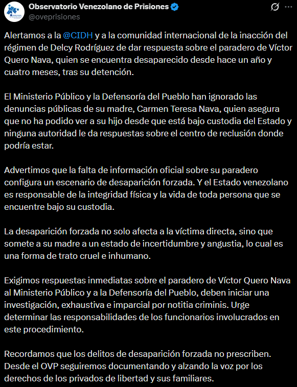 «Alertamos a la CIDH y a la comunidad internacional de la inacción del régimen de Delcy Rodríguez de dar respuesta sobre el paradero de Víctor Quero Navas, quien se encuentra desaparecido desde hace un año y cuatro meses, tras su detención.