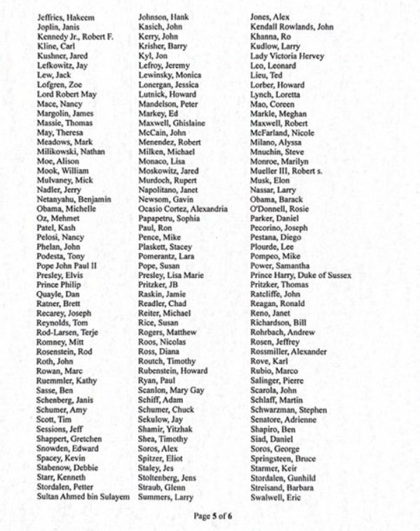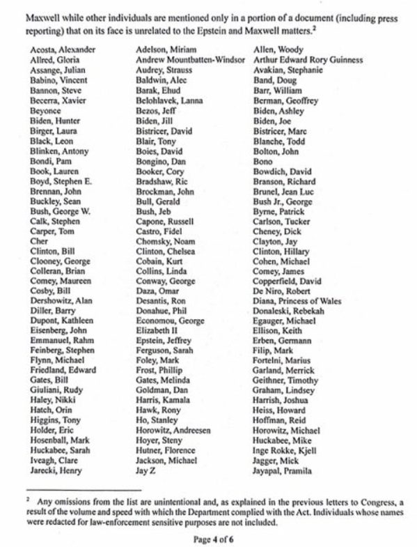 De acuerdo con la Ley de Transparencia de Archivos Epstein, la lista de nombres incluye «todas las personas que (1) son o fueron funcionarios gubernamentales o personas políticamente expuestas y (2) su nombre aparece en los expedientes publicados bajo la Ley al menos una vez», señalaba la carta, añadiendo que los nombres aparecen en una «amplia variedad de contextos.»