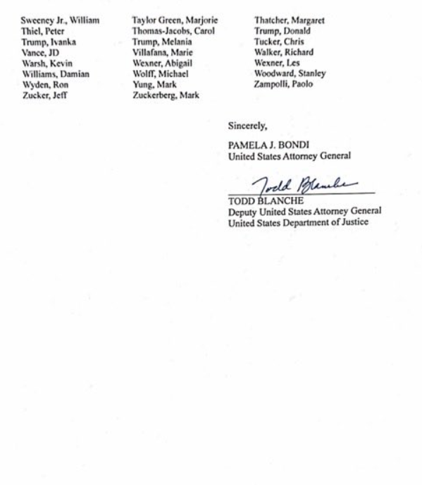 Pam Bondi publicó completa la lista Epstein en una CARTA dirigida al Senado de EEUU